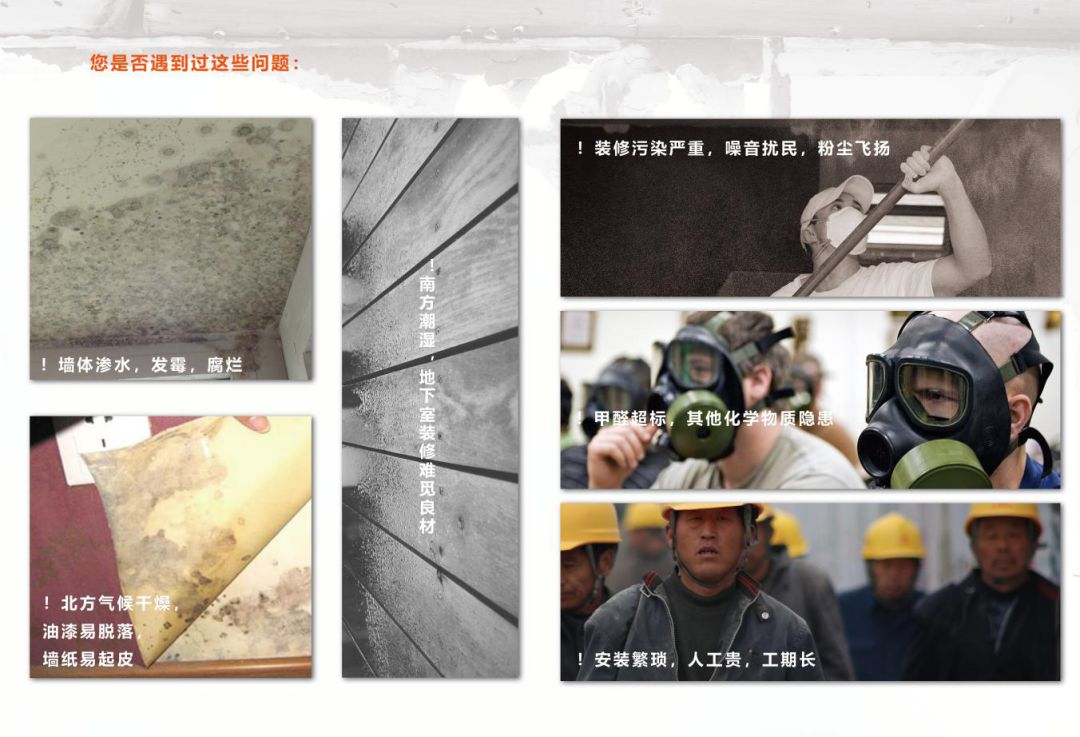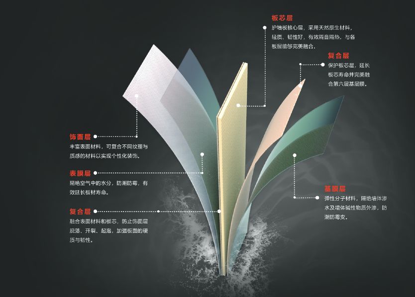 无甲醛,无毒,无害。防水防潮防霉。30年不老化,不变形。重量比同类型材料轻50%以上。隔音保温降能耗达20%以上。表面热熔复合麻质,绒质,皮质,质感强。配套铝合金,不锈钢,木质线条,卡扣形式,不用胶水,毛胚墙安装。美工刀切割,安装无粉尘,速度快,即装即住。