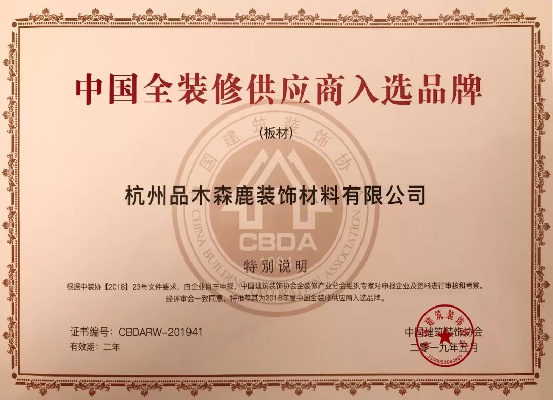 2019年5月,森鹿品牌荣获由中国建筑装饰协会举办的"绿色人居 智慧未来"2019中国未来人居产业发展大会。森鹿品牌成功入选《中国全装修供应商推介目录》。