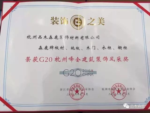 2016年森鹿品牌荣获“G20杭州峰会建筑装饰风采奖”。