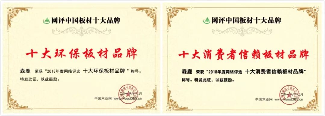森鹿产品,健康环保的代名词。作为一个拥有25年发展历史的木产品企业,森鹿曾连续获得“生态板网络评选十大品牌”、“胶合板网络评选十大品牌”、“最具影响力品牌”、“G20装饰之美”成为“CCTV7的展播企业”,并且荣获“家居装饰行业中国民族品牌”,2018年森鹿品牌再次荣获“十大环保板材品牌”、“十大消费者信赖板材品牌”等多项荣誉
