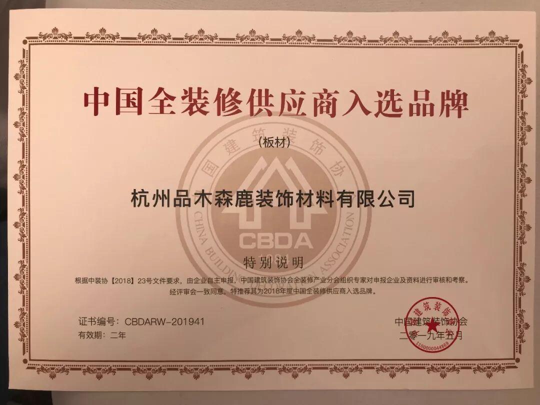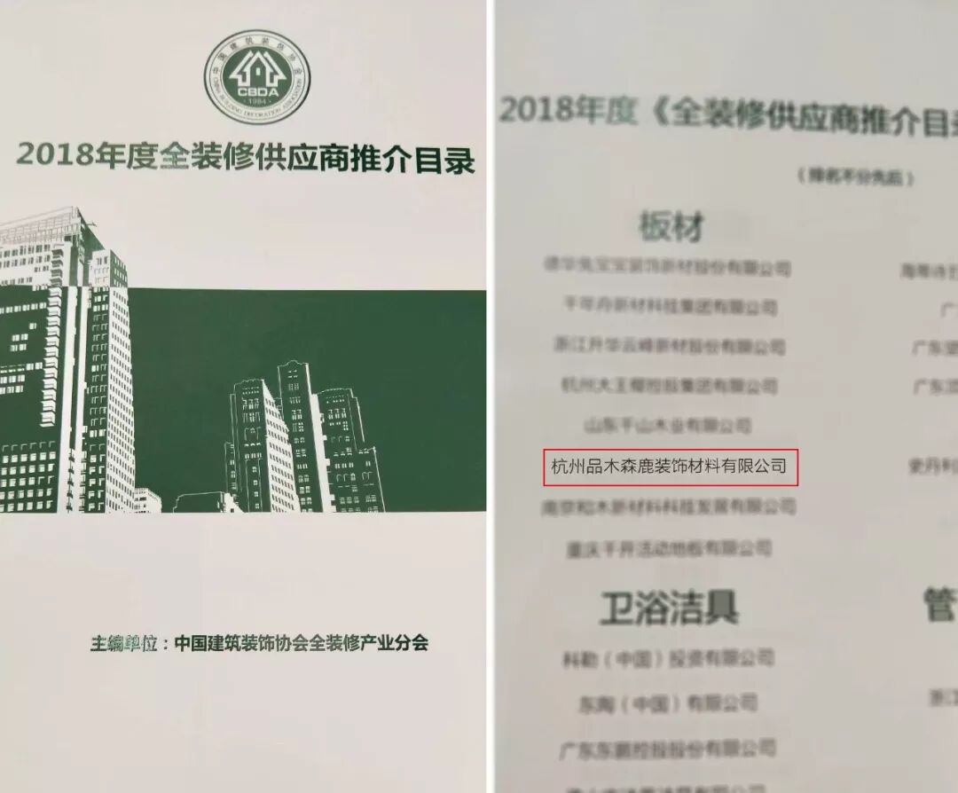 会议上中国建筑装饰协会公布了2018年入选中国全装修供应商推介目录的企业名单,杭州品木森鹿装饰材料有限公司旗下森鹿品牌为板材类目的入选品牌。